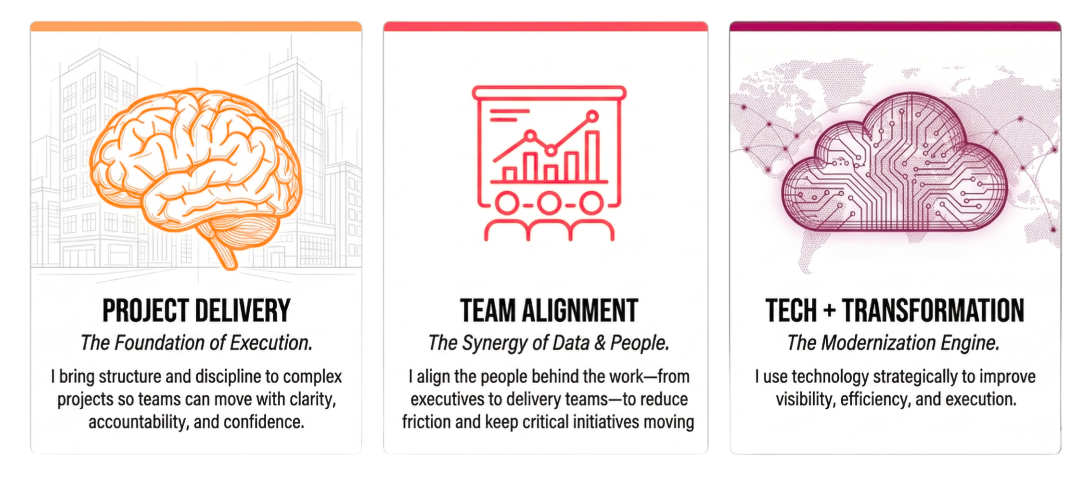 I help organizations deliver complex projects with more clarity, less friction, and stronger execution. From technology modernization to infrastructure initiatives, I align budgets, timelines, teams, and stakeholders to keep critical work moving.